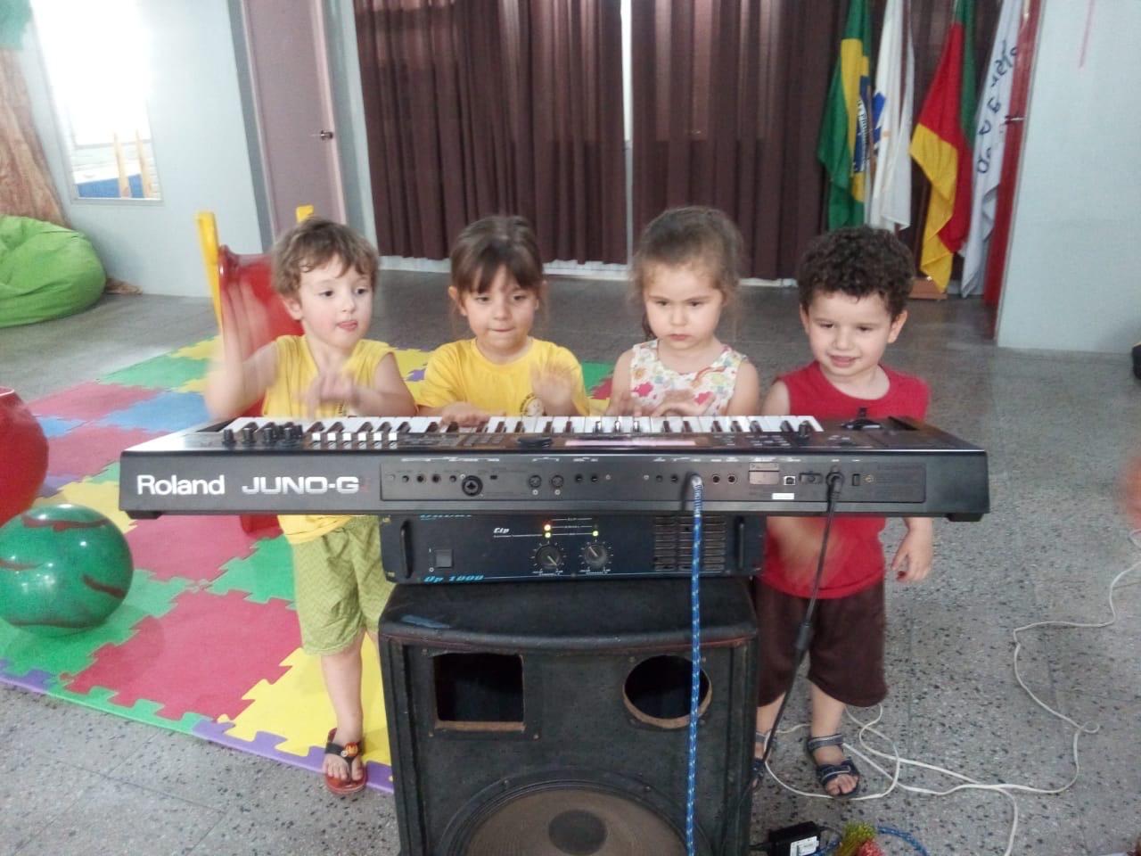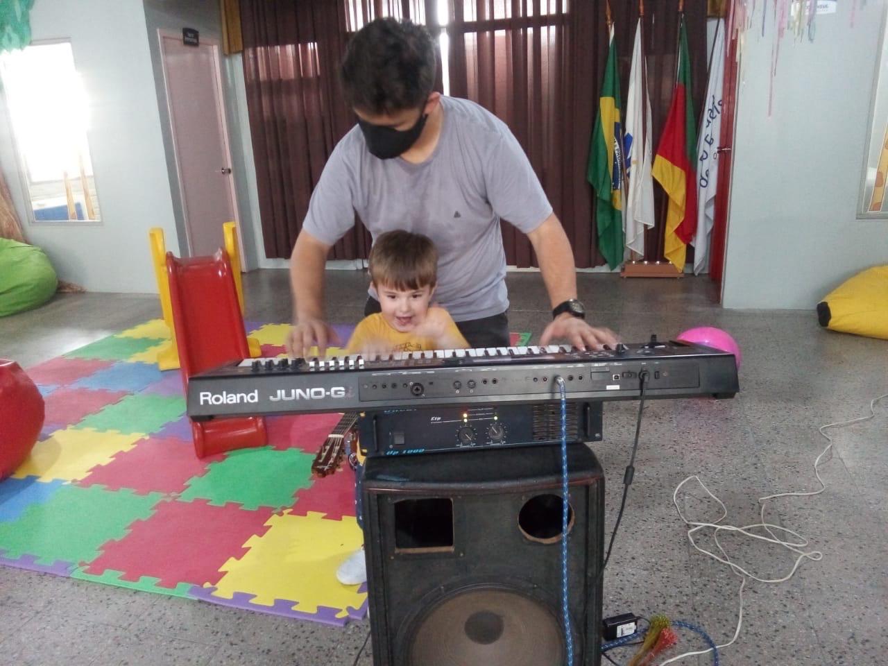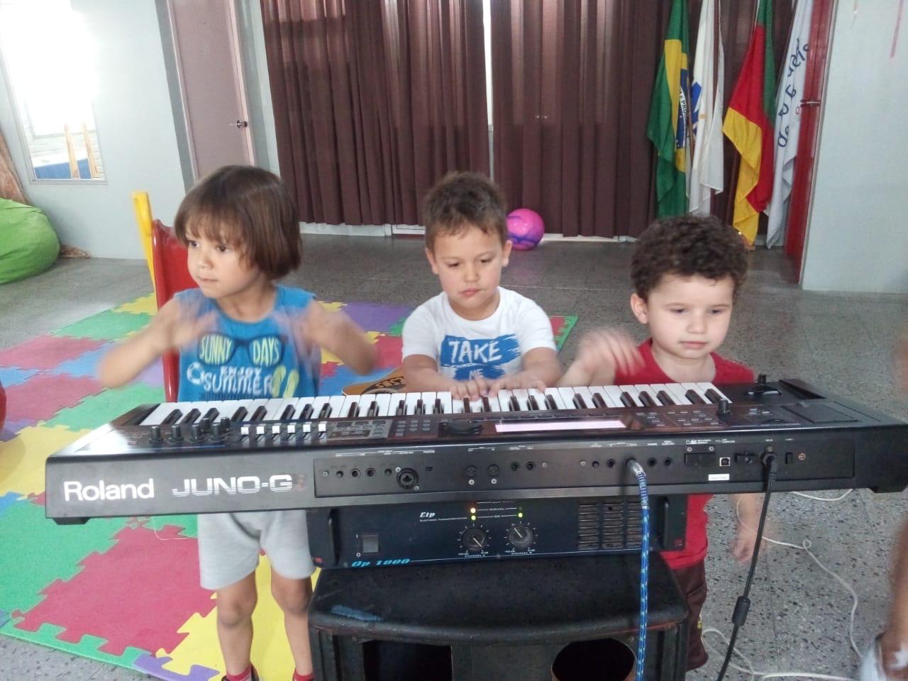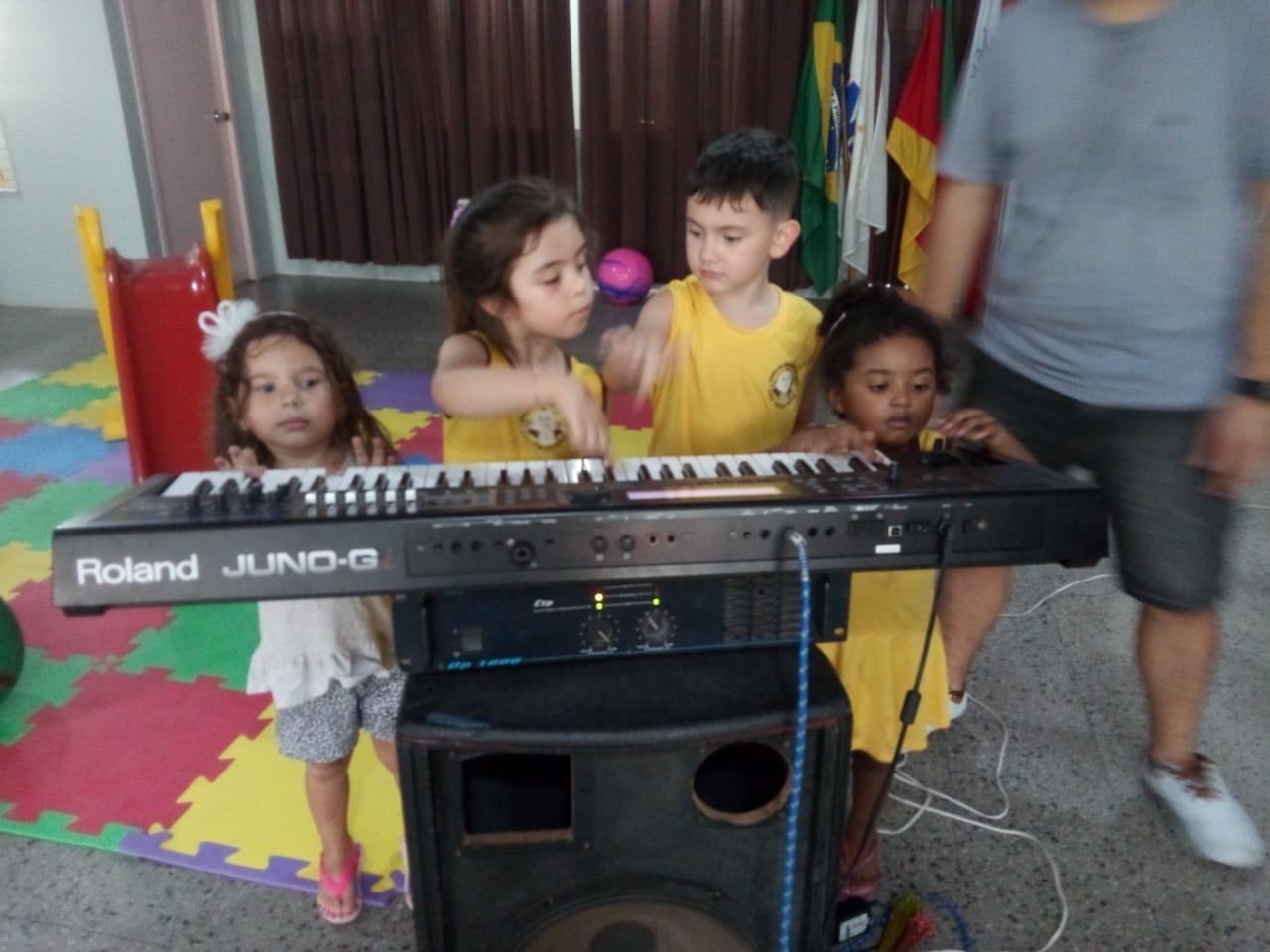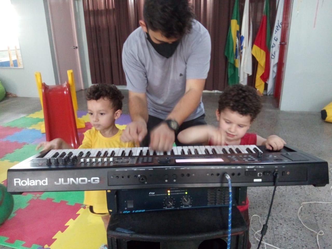 Os alunos interagem com os instrumentos de percussão, violão e teclado nas práticas musicais, ampliando a versatilidade sonora.